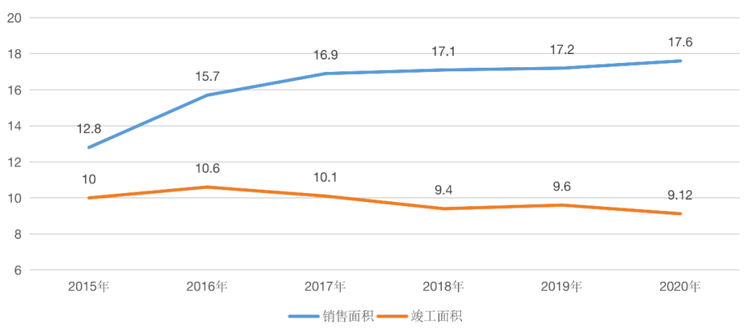 值得注意的是,國家統計局數據顯示,房地產銷售面積和竣工面積加速背離。2020年,竣工面積為9.12億平方米,同比減少4.9%。與之形成明顯反差的是,銷售面積同比正增長,兩者差距有擴大趨勢。究其原因,一方面受疫情影響,工期普遍延后,加速竣工增速回落。