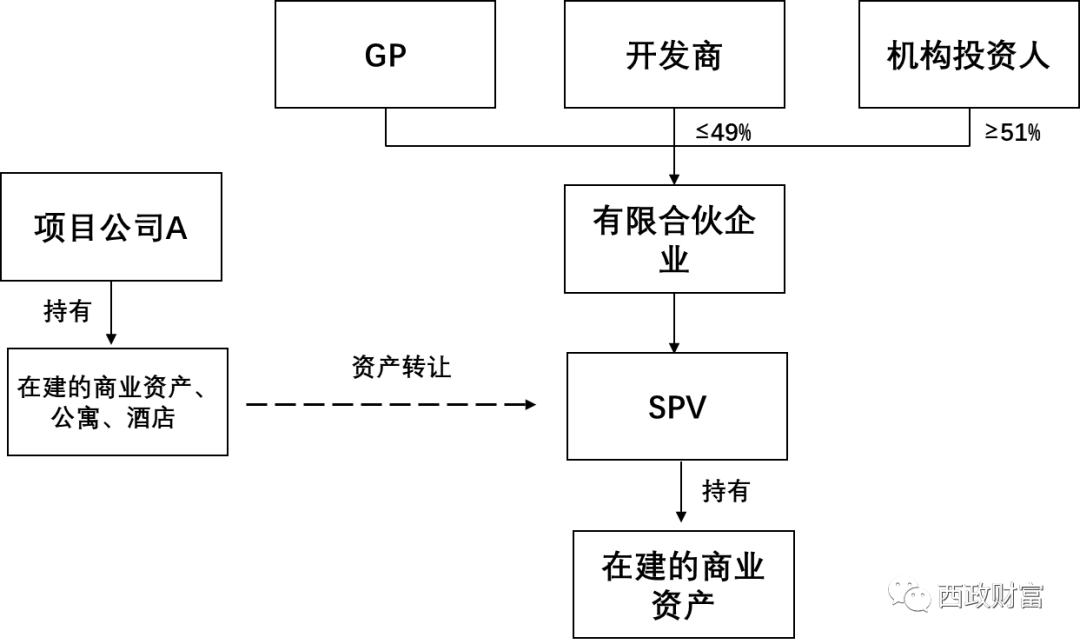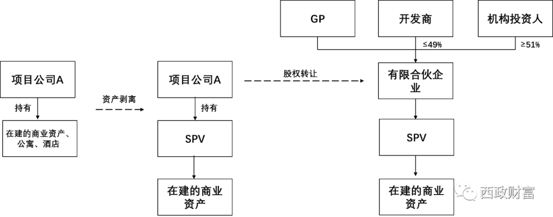 1. 機構投資人與開發商共同成立合伙企業,其中機構投資人持股51%以上,并由合伙企業設立SPV,SPV從項目公司A處資產收購在建的商業資產,將資產予以單獨剝離。不過需注意直接資產轉讓所應承擔的稅費問題。