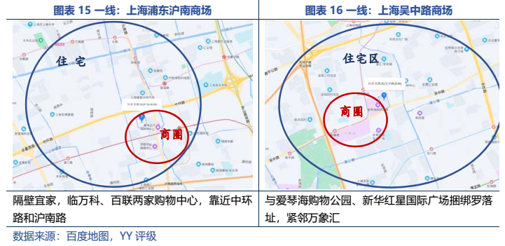 目前,即期財務壓力構成最核心的矛盾,短期來看銀行借款在抵押物支撐下得以滾續(但不排除在商場經營效益下滑趨勢下銀行斷貸或要求新增抵押物的可能);長期而言,傳統主營業務坪效走向下坡,或造成資產估值折損風險,而公司仍在擴建自有商場,委管收入逐年下降,且商品零售及家裝作為公司預期的新增長點仍有待觀望,資產質量的擔憂以至于對商業模式重估(店面租金高企、購買力不足的矛盾)。