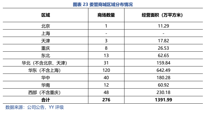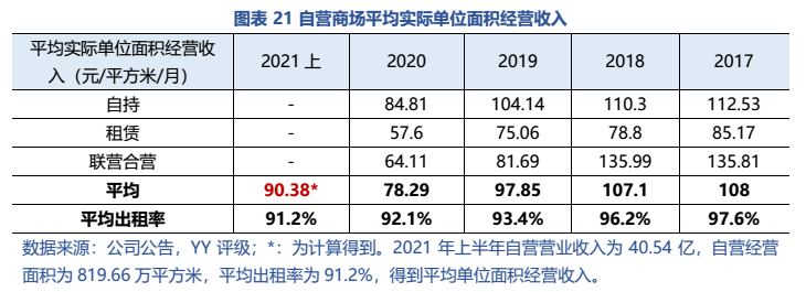 從經營表現來看:1)自營業務收入穩定,自持商場分布于一二線核心城市,但整體來說,坪效走向下坡,回報率逐年下降。2)委管業務資金占用小,有一定的利潤貢獻,但未挑起大梁,且被質疑“假委管”,存在表外負債及隱性經營兜底的風險;3)公司預打造新增長點——零售及家裝業務,但尚處于發展期,當前利潤貢獻仍十分有限,且還需持續投入資金。