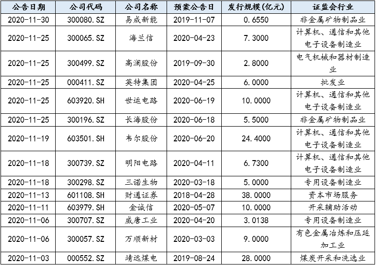 2020年11月可轉(zhuǎn)債董事會預案公告8只,發(fā)審委通過8只,股東大會通過20只,證監(jiān)會核準14只,具體情況見下表: