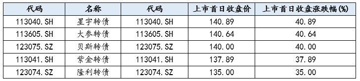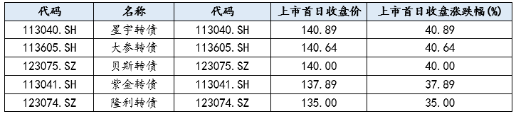 2、上市的21只轉(zhuǎn)債首日均收漲,漲幅前五的轉(zhuǎn)債為: