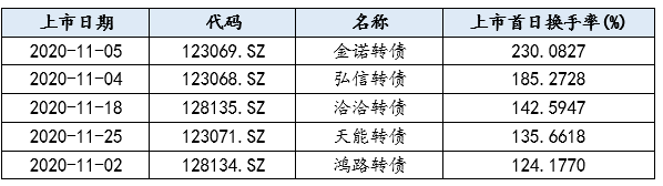 4、上市首日換手率排名前五的可轉(zhuǎn)債: