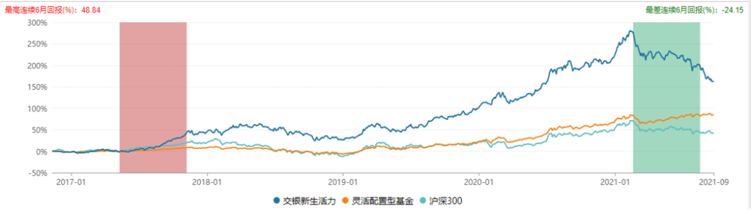 “交銀新生活力”成立以來的總回報為164.50%,而同期滬深300只有43.03%,從這一角度看,該基金的收益表現還是可圈可點的。
