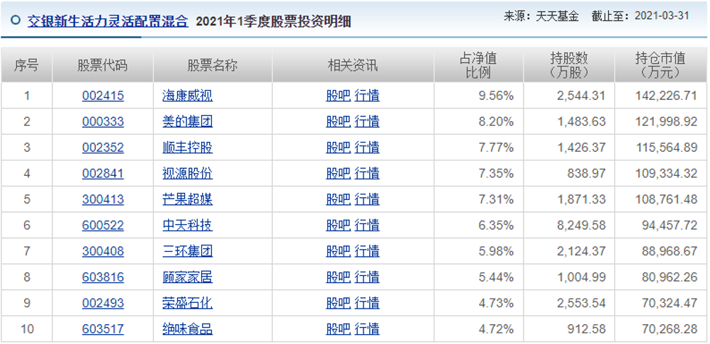 今年一季度,楊浩堅定看好出海定價權不錯的制造業、數字化零售和供應鏈、企業智能化資本開支,其管理的交銀新生活力重倉了海康威視、芒果超媒、視源股份、順豐控股、美的集團、中天科技、三環集團、顧家家居、絕味食品、榮盛石化等十只股票。