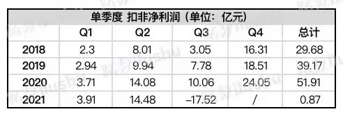 單2021年三季度3個月的扣非凈利潤,比上年同期下降274.27%,為-17.52億。這一下拉低公司前三季度扣非凈利潤的整體水平。