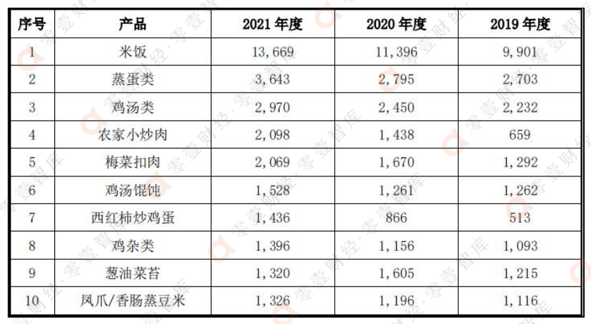事實上也確實如此,招股書顯示,餐廳產品前三位的分別是米飯、蒸蛋類以及雞湯類這類相對較為平價的菜品。2021年老鄉雞共賣出了1.37億份米飯,3600多萬份蒸蛋以及2900多萬份雞湯。