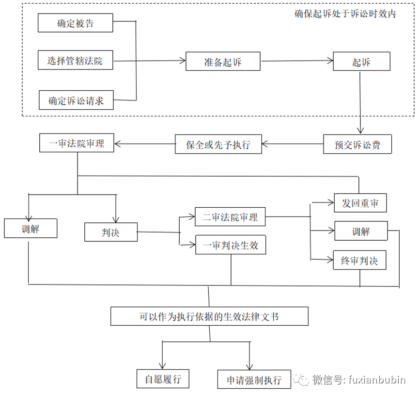 即通過民事訴訟、民商事仲裁、民事督促(支付令)、執(zhí)行公證債權(quán)文書、直接向法院申請(qǐng)實(shí)現(xiàn)擔(dān)保物權(quán)的方式,確立債權(quán)的合法性,依靠強(qiáng)制程序收回債權(quán)的清收處置方式。其中,訴訟流程較為復(fù)雜,主要如下圖所示: