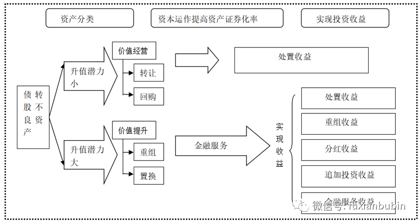 債轉(zhuǎn)股即通過以股抵債等方式獲得企業(yè)不良資產(chǎn),隨后通過改善企業(yè)經(jīng)營模式逐步提升企業(yè)資產(chǎn)價(jià)值,最終通過資產(chǎn)置換、并購、重組和上市方式等退出,實(shí)現(xiàn)債轉(zhuǎn)股資產(chǎn)增值。其基本模式如下: