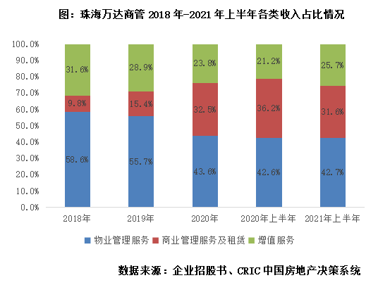 物業管理服務為珠海萬達最主要的營收來源,商業管理服務及租賃收入占比持續上升。根據企業招股書披露數據,2021年上半年,珠海萬達共實現營收106.4億元,其中物業管理服務45.4億元,商業管理服務及租賃33.6億元,增值服務收入27.4億元,占比分別為42.7%、31.6%、25.7%。從2018年至2021年上半年的趨勢來看,企業三項業務收入均呈現穩步增長的態勢,但商業管理服務及租賃收入上升更加明顯,因此占比持續提高,物業管理服務收入依托企業在管面積穩定增長,仍是企業發展的主要方向。