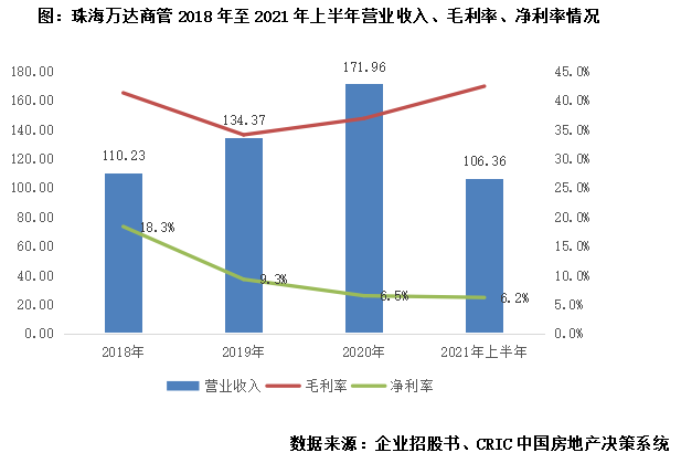 營收穩步增長,毛利率企穩回升,上半年凈利率受出售附屬公司影響。近年來,珠海萬達商管保持著同比超20%的營收增長率,2021年上半年實現營收106.4億元,同比增長42.7%,主要是由于去年同期疫情突發,企業業務受到一定影響,收入基數偏小。盈利方面,企業毛利率持續回升,上半年整體毛利率達42.4%,創下近三年新高。但上半年凈利率較低,主要是由于2021年3月及4月企業為調整運營模式,出售附屬公司虧損了13.2億元,因此可以預期后期企業凈利率仍有回升空間。