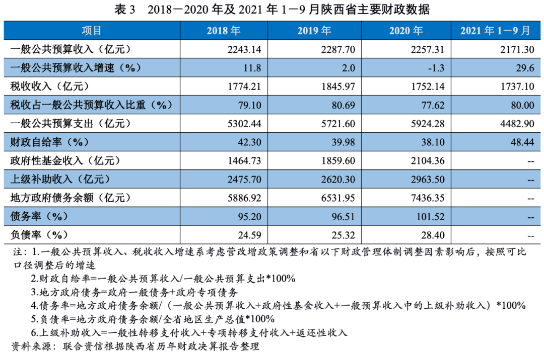 陜西省經(jīng)濟(jì)總量和人均GDP保持全國(guó)中游水平。2020年,受新冠肺炎疫情影響,陜西省經(jīng)濟(jì)增速有所放緩,2021年1-9月呈恢復(fù)性增長(zhǎng),但固定資產(chǎn)投資后勁不足,整體投資呈負(fù)增長(zhǎng)狀態(tài)。陜西省政府債務(wù)余額持續(xù)增長(zhǎng),2020年末排名全國(guó)第17位,政府債務(wù)率與負(fù)債率均處于全國(guó)中游水平,政府債務(wù)風(fēng)險(xiǎn)可控。