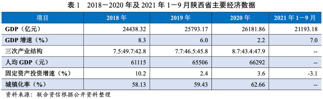 陜西省地處中國(guó)內(nèi)陸腹地,文化歷史悠久,資源豐富。陜西省經(jīng)濟(jì)總量和人均GDP處于全國(guó)中游水平。2018-2020年,陜西省經(jīng)濟(jì)持續(xù)增長(zhǎng),產(chǎn)業(yè)結(jié)構(gòu)更趨優(yōu)化,固定資產(chǎn)投資保持增長(zhǎng),但受新冠肺炎疫情影響,陜西省經(jīng)濟(jì)增速有所放緩。2021年1-9月,陜西省經(jīng)濟(jì)呈恢復(fù)性增長(zhǎng),但固定資產(chǎn)投資后勁不足,整體投資呈負(fù)增長(zhǎng)狀態(tài)。
