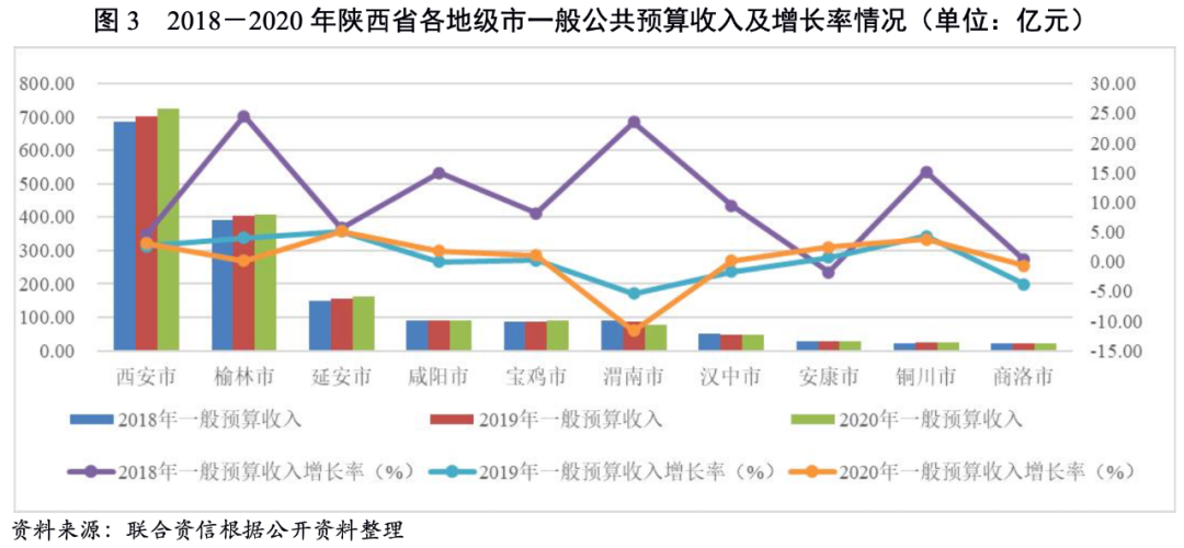 陜西省各地級(jí)市財(cái)政實(shí)力差異較大,省會(huì)西安市財(cái)政實(shí)力強(qiáng),榆林市和延安市分列第二、三位。2020年,陜西省大部分地級(jí)市一般公共預(yù)算收入呈增長(zhǎng)態(tài)勢(shì),但增速有所放緩,財(cái)政自給能力偏弱。2021年前三季度,受經(jīng)濟(jì)回暖等多因素影響,陜西省各地級(jí)市一般預(yù)算收入增速較上年同期大幅提升。陜西省各地級(jí)市政府債務(wù)余額均呈上升趨勢(shì),西安市政府債務(wù)償還能力仍強(qiáng)于其他地級(jí)市,延安市、商洛市、安康市和銅川市政府債務(wù)償還壓力相對(duì)較大。