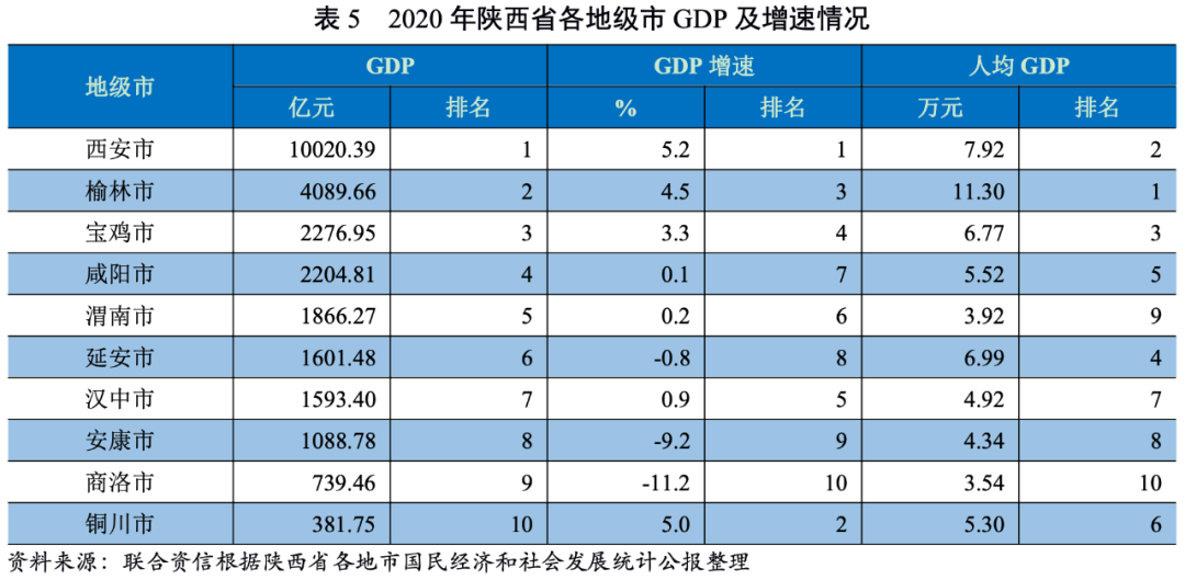 從GDP增速來(lái)看,受新冠肺炎疫情及經(jīng)濟(jì)下行等因素影響,2020年,陜西省各地級(jí)市的GDP增速普遍放緩,部分地級(jí)市出現(xiàn)較大幅度下降甚至表現(xiàn)為負(fù)增長(zhǎng)。西安市和銅川市GDP增速達(dá)到5.0%及以上,榆林市和寶雞市GDP增速在3.0%~5.0%之間,咸陽(yáng)市、渭南市和漢中市GDP增速在0.0~1.0%之間,延安市、安康市和商洛市均為負(fù)增長(zhǎng)。