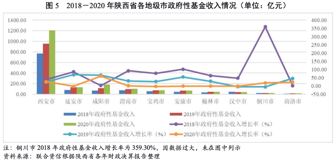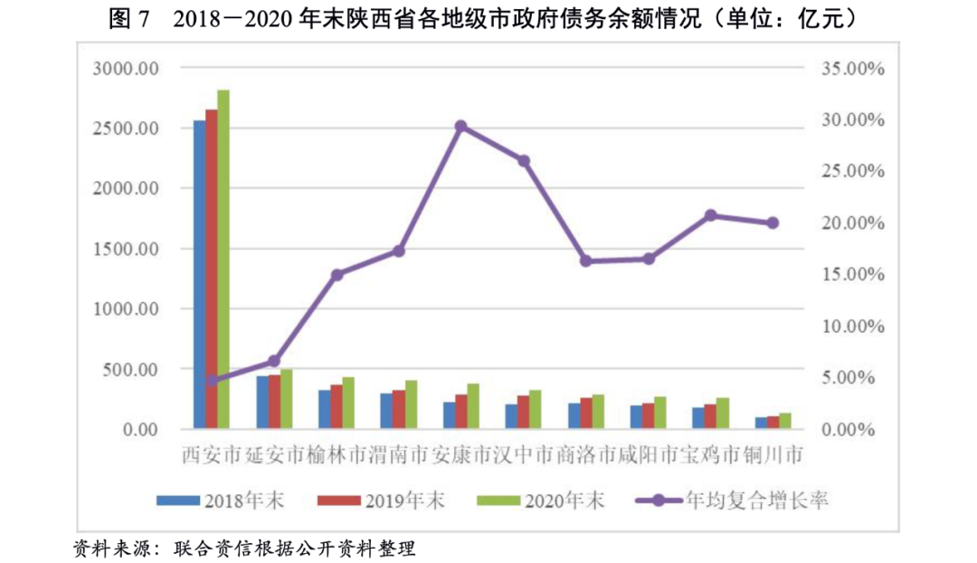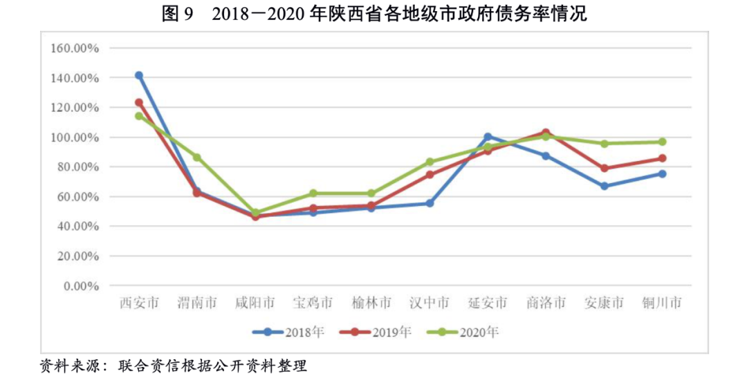 從各地級(jí)市政府綜合財(cái)力對(duì)“發(fā)債城投企業(yè)全部債務(wù)+地方政府債務(wù)”的保障支持程度來(lái)看,2020年地方綜合財(cái)力對(duì)“發(fā)債城投企業(yè)全部債務(wù)+地方政府債務(wù)”覆蓋程度最低的為西安市,其次為延安市和渭南市,覆蓋程度相對(duì)較高的為咸陽(yáng)市和漢中市。