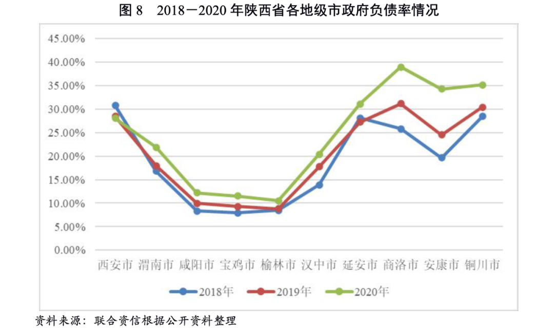 債務(wù)負(fù)擔(dān)方面,2018-2020年,除西安市外,其他地級(jí)市政府負(fù)債率均呈增長(zhǎng)態(tài)勢(shì)。2020年,商洛市政府負(fù)債率為省內(nèi)最高(38.92%),較上年增長(zhǎng)7.77個(gè)百分點(diǎn),商洛市政府負(fù)債率增長(zhǎng)最快(同比上升9.76個(gè)百分點(diǎn))。同期,榆林市、寶雞市和咸陽(yáng)市政府負(fù)債率均低于20%。