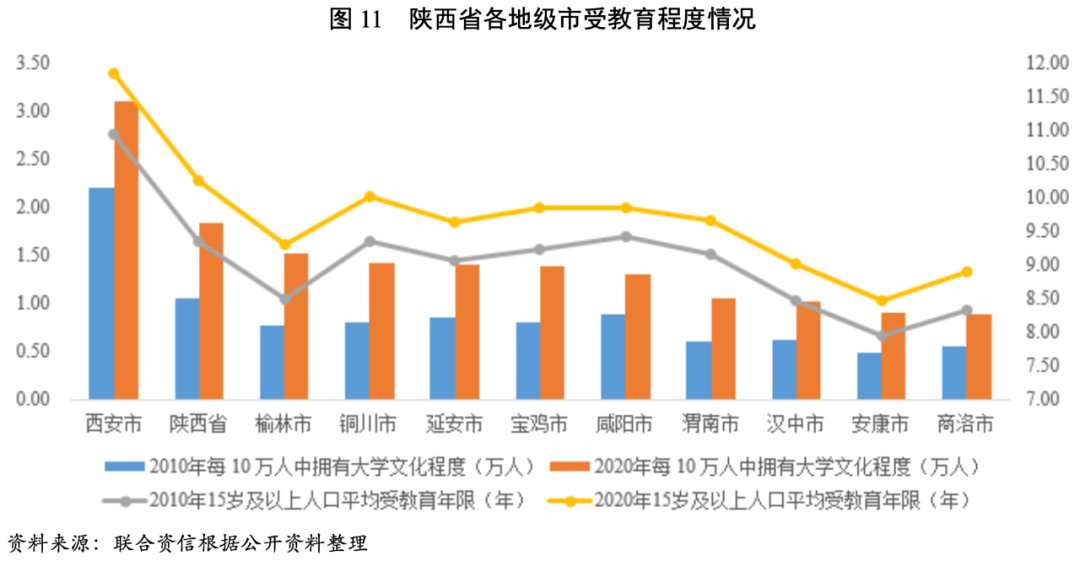 從受教育程度來(lái)看,省會(huì)西安市匯集了眾多高校、科研院所和科研基地,以航空、航天和軍工科研為代表的相關(guān)產(chǎn)業(yè)建立了西安閻良國(guó)家航空高技術(shù)產(chǎn)業(yè)基地和西安國(guó)家民用航天產(chǎn)業(yè)基地等國(guó)家級(jí)產(chǎn)業(yè)基地,人口受教育程度遠(yuǎn)高于其他地級(jí)市,每10萬(wàn)人中有大學(xué)文化程度的人數(shù)為3.10萬(wàn)人,15歲及以上人口平均受教育年限為10.95年,榆林市擁有大學(xué)文化程度人數(shù)排名第二。