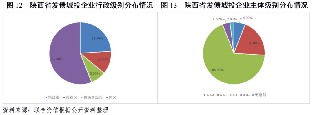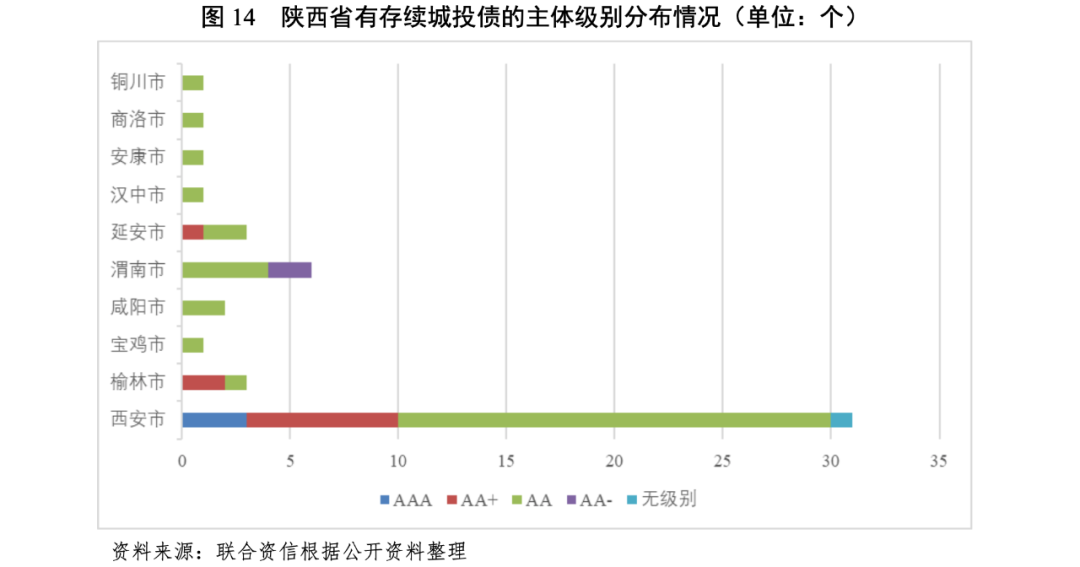 陜西省發(fā)債城投企業(yè)數(shù)量相對(duì)較少,信用等級(jí)以AA為主,AA+及以上的發(fā)債城投企業(yè)集中在西安市、榆林市和延安市。從行政區(qū)域看,陜西省發(fā)債城投企業(yè)集中在西安市,且以園區(qū)類城投企業(yè)為主。