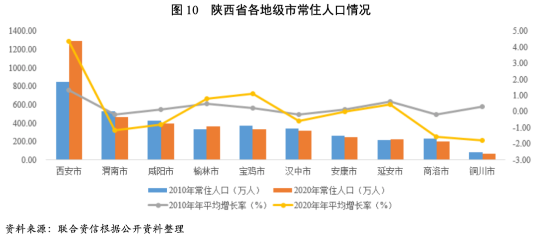 陜西省各地級(jí)市常住人口數(shù)量規(guī)模差距較大,省會(huì)西安市人口數(shù)量明顯高于其他地級(jí)市,占全省常住人口的32.77%,渭南市以468.87萬(wàn)人位居第二,其他地級(jí)市均未超過(guò)400萬(wàn)人,其中銅川市常住人口數(shù)量低于7萬(wàn)人。同2010年第六次人口普查相比,僅西安市、榆林市和寶雞市年平均增長(zhǎng)率保持正增長(zhǎng),其中年平均增長(zhǎng)率最高及增幅最大的為西安市(4.34%),其余地級(jí)市均為負(fù)增長(zhǎng),其中銅川市人口流失最為嚴(yán)重(-1.80%)。
