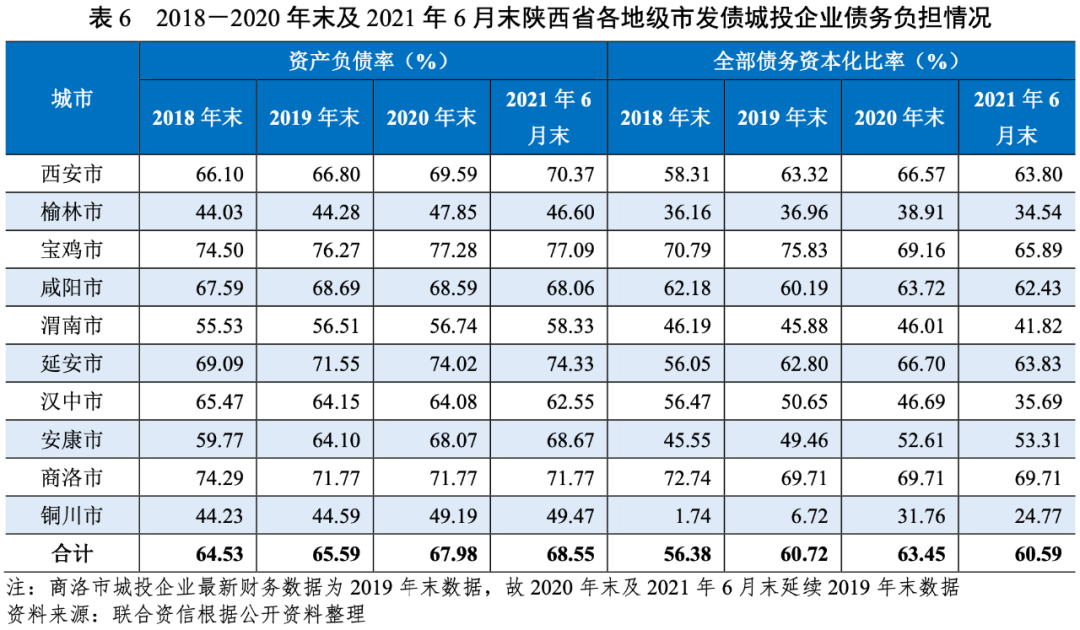 從發(fā)債城投企業(yè)全部債務(wù)與“發(fā)債城投企業(yè)全部債務(wù)+地方政府債務(wù)”的比值看,截至2020年末,西安市比值最高,達(dá)71.76%,延安市和咸陽(yáng)市的比值超過(guò)50%,漢中市比值最低,為14.52%。