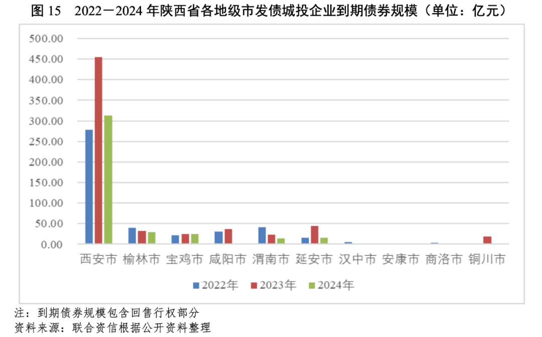 從陜西省各地級(jí)市發(fā)債城投企業(yè)未來(lái)三年(2022-2024年)到期債券規(guī)模看,西安市發(fā)債城投企業(yè)未來(lái)三年到期債券規(guī)模較大,安康市無(wú)未來(lái)三年內(nèi)到期債券,其他地級(jí)市城投企業(yè)到期債券規(guī)模相對(duì)較小。從陜西省各地級(jí)市發(fā)債城投企業(yè)未來(lái)三年到期債券規(guī)模占已發(fā)行債券規(guī)模的比重看,寶雞市、漢中市、商洛市和銅川市發(fā)債城投企業(yè)存續(xù)債券將于未來(lái)三年內(nèi)全部到期,其他地級(jí)市(除安康市外)占比在60%~90%之間。