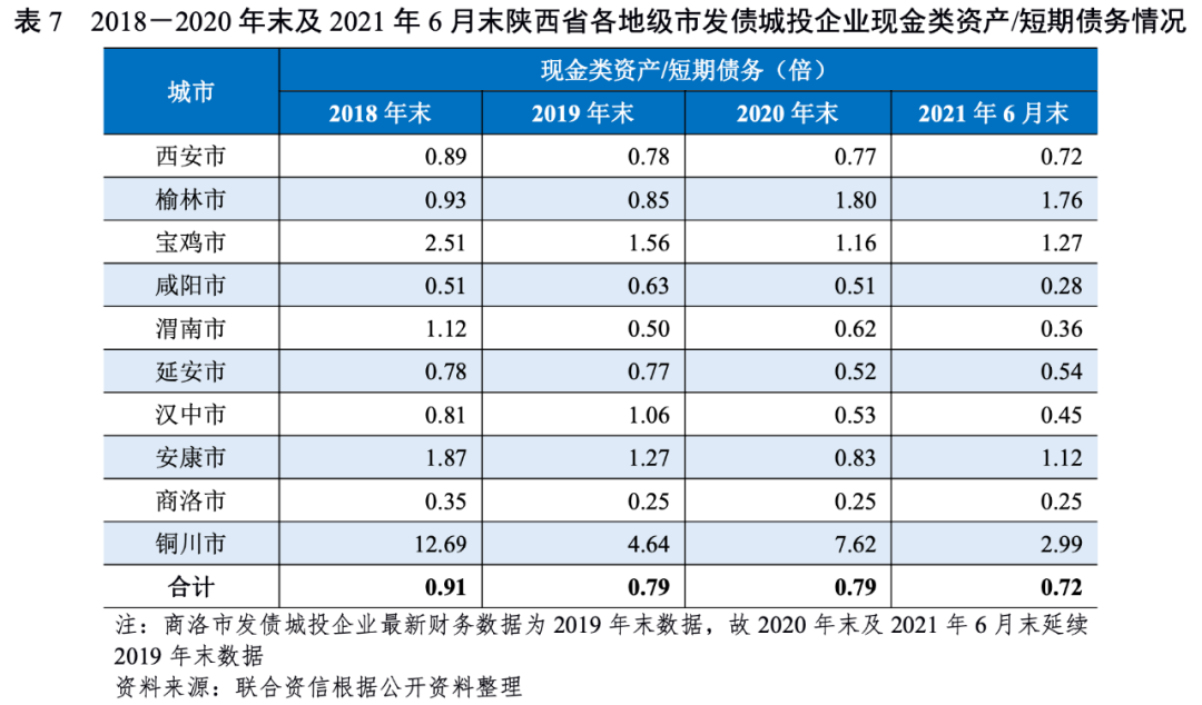 2020年以來(lái),陜西省大部分發(fā)債城投企業(yè)債務(wù)負(fù)擔(dān)有所上升,貨幣資金對(duì)短期債務(wù)的覆蓋程度有所下降,其中咸陽(yáng)市、延安市和漢中市短期償債能力相對(duì)較弱。