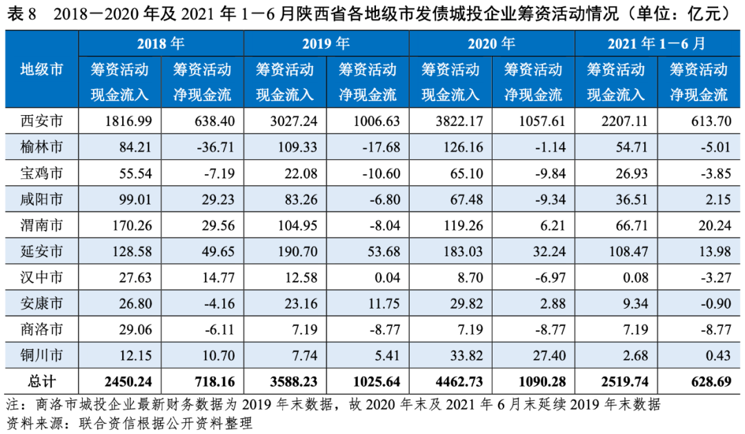 從陜西省各地級(jí)市發(fā)債城投企業(yè)籌資活動(dòng)凈現(xiàn)金流狀況來(lái)看,2018-2020年,陜西省發(fā)債城投企業(yè)整體籌資活動(dòng)現(xiàn)金流入和籌資活動(dòng)凈現(xiàn)金流均有所增長(zhǎng)。具體來(lái)看,2020年,西安市發(fā)債城投企業(yè)融資需求仍較大,延安市、安康市和銅川市發(fā)債城投企業(yè)保持一定融資需求,渭南市發(fā)債城投企業(yè)融資需求有所擴(kuò)大,其他地級(jí)市發(fā)債城投企業(yè)融資需求不強(qiáng)。
