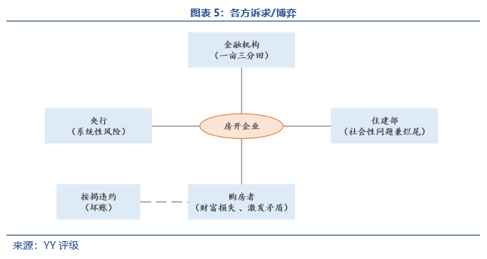 接著,如果違約或者風(fēng)險處置時,我們引入住建部、金融機構(gòu)(債委會)、房地產(chǎn)企業(yè)、購房者博弈、央行各自訴求: