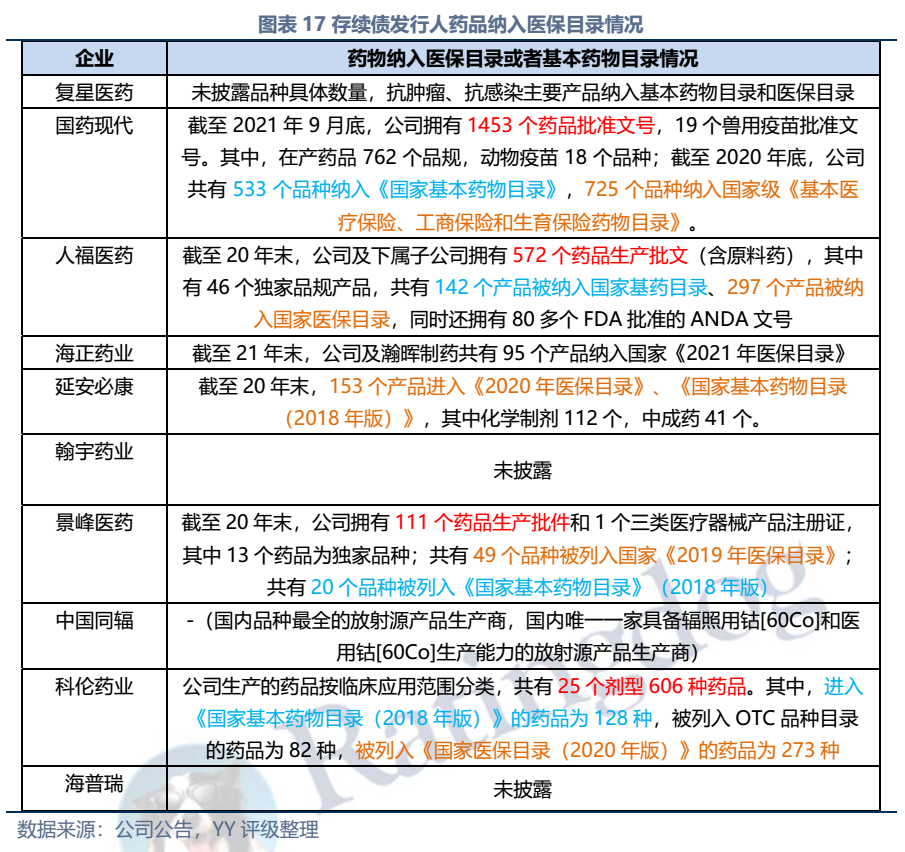 截至2022年3月末西藥行業發債主體存續債券余額僅214億元,存續債主體11家(含已違約的延安必康、已展期的景峰醫藥),具體來看:復星醫藥、國藥現代、人福醫藥、海正藥業、延安必康、翰宇藥業和景峰藥業擁有較多樣化的產品布局,復星醫藥(在抗感染、中樞神經和消化系統)、國藥現代(在抗感染、心腦血管)和人福醫藥(在心腦血管)具備較高的行業地位,中國同輻、科倫藥業和海普瑞產品則多聚焦于某一細分領域。財務方面,整體銷售毛利率較高(平均約50%),但銷售費用對利潤侵蝕較大(銷售費用/營收平均30%),存續發行人中除延安必康、景峰醫藥和翰宇藥業凈利潤出現虧損外,其他表現尚可;資產及負債方面,復星醫藥總資產顯著高于其他企業,規模優勢顯著;海正集團本部杠桿率很高,需關注債務壓力;行業整體短債占比較高,存在一定流動性壓力。