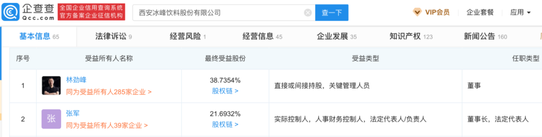 企查查顯示,糖酒集團(tuán)持有冰峰飲料99%股權(quán),還通過全資子公司——久悅酒業(yè)持股1%。糖酒集團(tuán)董事長(zhǎng)兼總經(jīng)理張軍,同時(shí)擔(dān)任冰峰飲料董事長(zhǎng)職務(wù),最終持股21.70%。盈信投資集團(tuán)董事長(zhǎng)林勁峰間接持股38.73%。