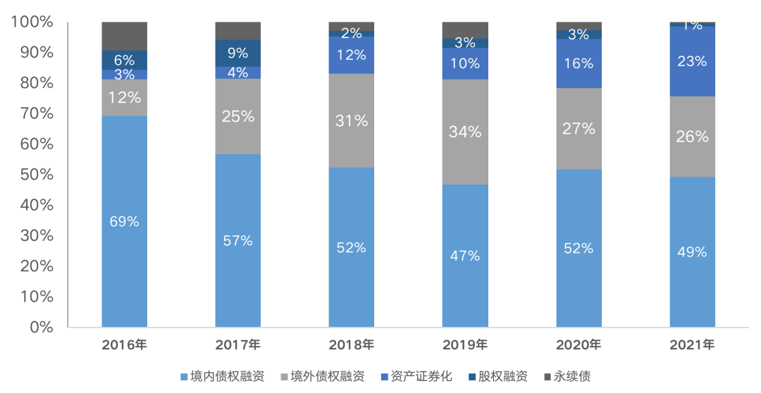 從融資結構來看,2021年融資占比最高的仍是境內債權融資,占比達到49%。2021年房企境內債權融資同比下降29%至6436億元;境外債權融資量3435億元,同比下降26%;股權融資和永續債分別募集112億元和58億元,降幅較大,分別較同比下降77%和88%,在三條紅線出臺后,永續債也納入全口徑負債監管,企業永續債發債持續下降。