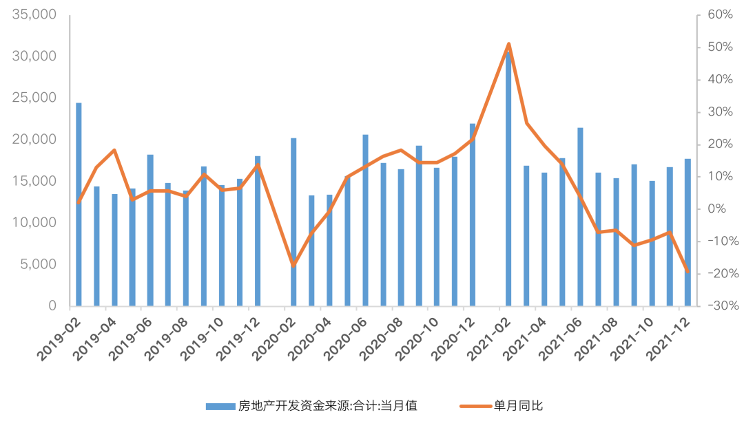 從房地產開發到位資金來看,2021年1-12月,房地產開發企業到位資金201132億元,同比增長4.2%,規模創歷史新高,但增速創近六年新低。且增速逐月下滑,下半年起到位資金單月值同比出現負增長,9月同比降幅達到11.2%。四季度政策密集發聲后,但年末到位資金增速仍表現不佳,12月單月到位資金17770億元,同比下降19.3%,單月到位資金規模低于歷史同期,同比增速創近五年新低。
