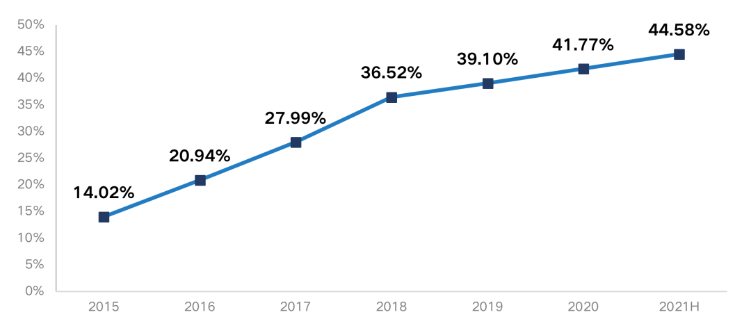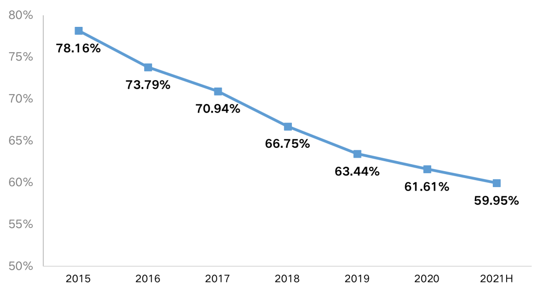 2021年房企主動或被動減少融資,房企整體資金壓力依然處于緊張狀態,房地產開發到位資金增速逐月下滑,下半年起到位資金單月值同比出現負增長,且融資總量達近五年最低點,調控持續收緊下,房企更加依賴銷售回款和自籌資金。
