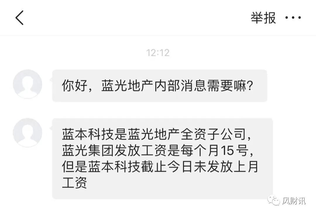 風(fēng)財(cái)訊報(bào)道 近日據(jù)藍(lán)光系員工爆料,藍(lán)光發(fā)展集團(tuán)全資子公司“藍(lán)本科技”,截止5月18日仍未發(fā)放上個(gè)月(4月)的工資。藍(lán)光集團(tuán)每個(gè)月15號(hào)發(fā)放工資。