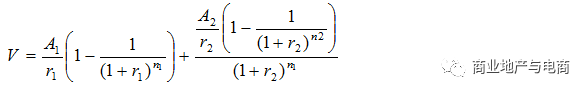 其中A1為現(xiàn)有租約租金收益,r1為租期內(nèi)資本化率,n1為現(xiàn)有租約剩余租期;A2為市場(chǎng)租金水平,r2為租期外資本化率,n2為租約外剩余土地年期。