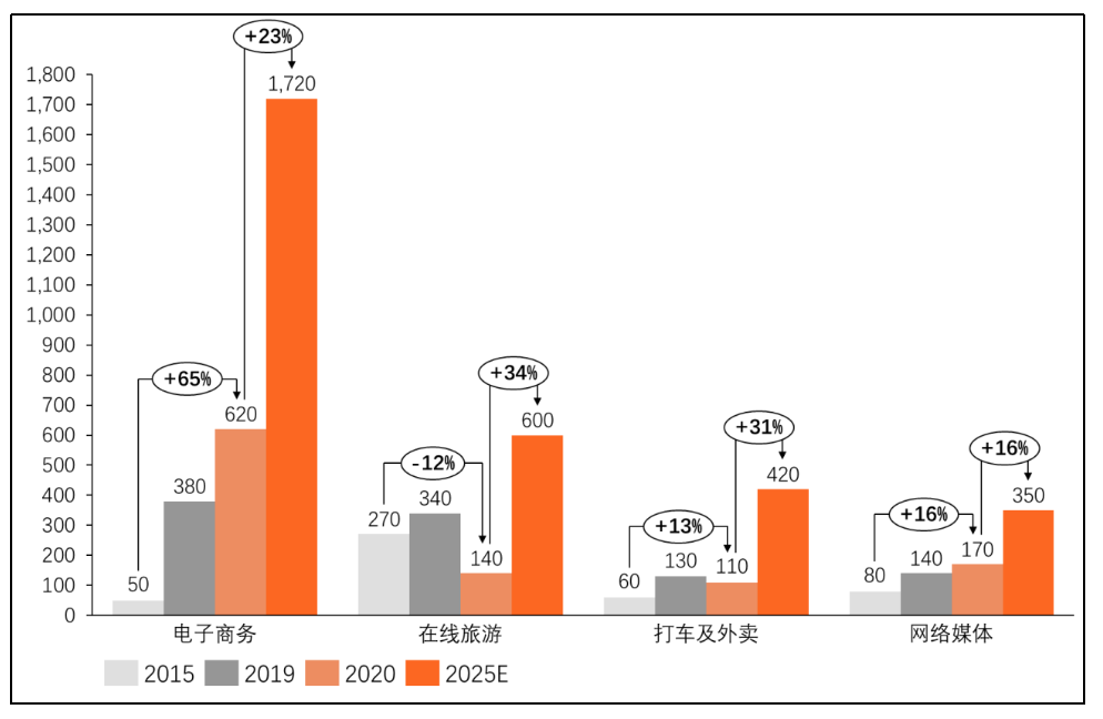 分行業看,2020年東南亞電子商務、在線旅游、打車及外賣服務、網絡媒體GMV則分別為620億美元、140億美元、110億美元、170億美元,2015年-2020年年均復合增長率分別為65%、-12%、13%、16%。其中電商占東南亞互聯網經濟整體規模59.6%,其他三類則占比在15%左右,主要是由于2020年受新冠疫情影響,在線旅游和交通出行行業出現了萎縮,電商和網絡媒體的快速增長一定程度抵消了其負面影響。預計2025年電子商務、在線旅游、打車及外賣服務、網絡媒體GMV將分別達到1720億美元、600億美元、420億美元和350億美元,預計2020年-2025年年均復合增長率將達到23%、34%、31%、16%。