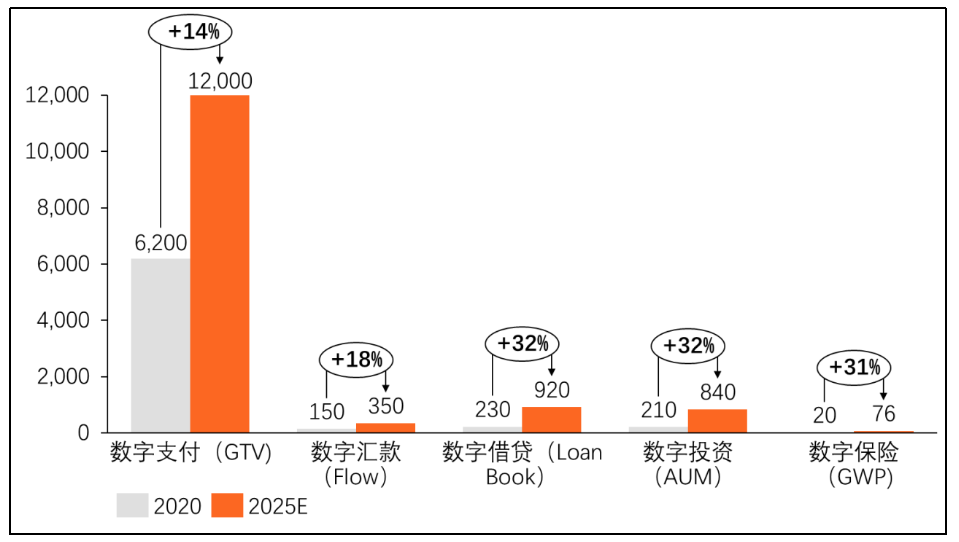 其中數字支付服務發展規模最大,目前數字支付總交易額(GTV)已達6200億美元,預計2025年總交易額(GTV)將達到12000億美元,主要來源于電商、打車等線上交易服務帶來的支付驅動。此外盡管其他金融服務仍然處于初級數字化階段,但是據預測2020至2025年未來五年內,數字匯款、借貸、投資和保險的滲透率將會有兩到三倍的增長,依次達到28%、8%、11%、9%。預計2020年-2025年均復合增長率將依次達到18%、32%、32%、31%。