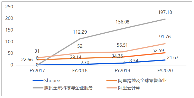 注:1.Shopee為騰訊投資東南亞電商公司;2.阿里跨境零售營收包括自營東南亞電商Lazada、速賣通、土耳其電商Trendyol;3.騰訊云計算業務營收目前屬于金融科技與企業服務類目