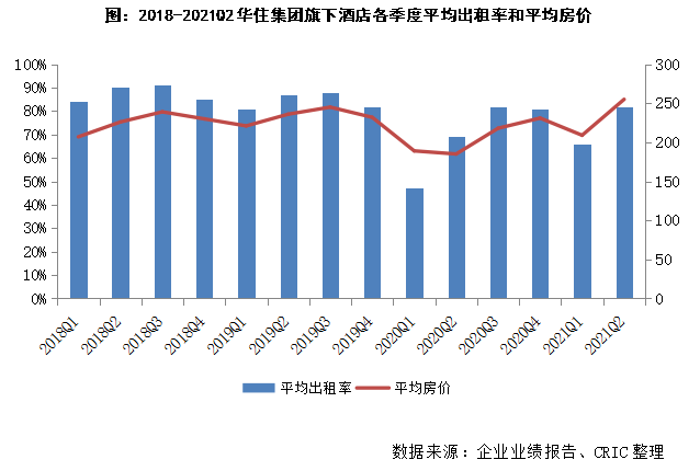 雖然我國酒店業(yè)整體的恢復相對較慢,但是作為龍頭企業(yè)的華住集團的恢復情況卻相對較好。從企業(yè)的業(yè)績報告數(shù)據(jù)來看,華住從2020年三季度開始其旗下酒店單季度的平均出租率就基本恢復到了疫情前的水平,平均房價也逐漸提升,2021年二季度還達到了近年來最高的255元/天。