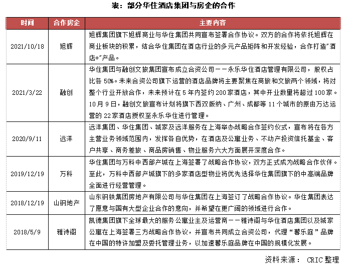 華住集團較快走出修復行情除了是因為集團主打的經(jīng)濟型酒店相對而言在疫情的打擊下恢復較快,同時也是因為企業(yè)旗下管理加盟和特許經(jīng)營酒店的業(yè)績增長迅速,收入占比達到了37.1%,是歷年來的最高值。華住集團很早開始就推進輕資產(chǎn)化,從2016年開始其管理加盟及特許經(jīng)營酒店占比就超過了80%,截至2021年中期這一數(shù)字為85%,繼續(xù)保持在高位。在這個背景下,華住集團與房企也開始積極合作以擴大酒店運營規(guī)模,比如在今年3月和融創(chuàng)成立了合資公司永樂華住,此后融創(chuàng)又在10月9日將原來由萬達酒店運營的22家酒店交于永樂華住運營。此前,華住還和遠洋、萬科、山鋼地產(chǎn)、雅詩閣等企業(yè)有戰(zhàn)略合作,加上此次跟旭輝達成合作,其輕資產(chǎn)擴張更進一步。