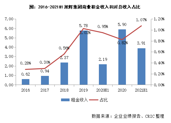 旭輝商業(yè)近年來顯著加大了合作的力度,主要是因為其在2019年整合了旗下商業(yè)板塊之后,對于商業(yè)板塊的投入力度明顯加大,每年都會拿出集團投資額的10%用于商業(yè)拓展,同時也提出“未來旭輝希望收入50%來自住宅開發(fā),30%來自租金收入,另外20%來自其他業(yè)務(wù)”,對商業(yè)地產(chǎn)領(lǐng)域的雄心可見一斑。但是當前的旭輝商業(yè)仍處于起步階段,規(guī)模相對較小。截至2021年中期,旭輝商業(yè)共有9個商業(yè)綜合體在營,在營建面63萬平米,與行業(yè)前列的萬達、華潤、龍湖等企業(yè)仍有著不小的差距。相應(yīng)的,旭輝商業(yè)帶來的租金收入也相對較少,2021上半年旭輝商業(yè)板塊的租金收入約為3.91億元,同比增加78.5%,僅占集團上半年總收入的1.07%。