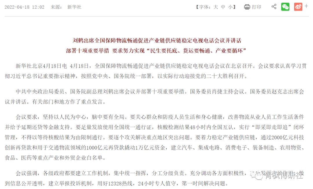 二、全國保障物流暢通促進產(chǎn)業(yè)鏈供應鏈穩(wěn)定電視電話會議:釋放出更多信息