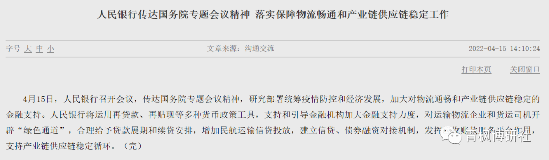 (一)2022年4月15日,央行召開會議,傳達國務院專題會議精神,進一步落實保障物流暢通和產(chǎn)業(yè)鏈供應鏈穩(wěn)定工作,明確將運用再貸款、再貼現(xiàn)等多種貨幣政策工具,通過合理給予貸款展期和續(xù)貸安排,建立信貸和債券融資對接機制,支持和引導金融機構加大對運輸物流企業(yè)和貨運司機的金融支持力度,增加民航運輸信貸投放。可以看出,此次會議的針對性較強,重在運輸物流行業(yè)。
