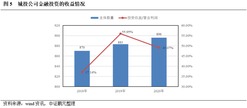 (2)城投公司開展金融投資在財報中最直接、最集中地體現在兩個科目中,一是“可供出售金融資產”,另一個是“長期股權投資”,2018-2020年上述兩大科目的期末余額在總資產中的占比均值之和分別為5.11%、5.35%、5.74%,而其他科目的期末余額在總資產中的占比均值之和分別為0.09%、0.30%、0.31%,另外,兩大科目的期末余額在總資產中的占比相差不大(見圖1);