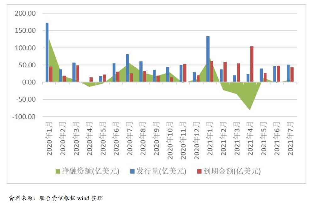 美元債融資方面,發行量同比大幅減少,凈融資規模為負。2021年1-7月,境內房地產企業美元債發行總量353.08億美元,同比減少16.69%,受境內房企違約事件頻發影響,加之恒大風險持續發酵,投資者風險偏好降低,自2月以來,地產美元債發行量保持低位;凈融資規模方面,2021年1-7月,境內房地產企業美元債到期401.13億美元,凈融資轉為凈流出;分月份看,為應對年內到期的美元債兌付,1月境內房地產企業美元債凈融資規模較大,2-4月凈融資規模持續凈流出且規模較大,5月以來凈融資規模保持低位。