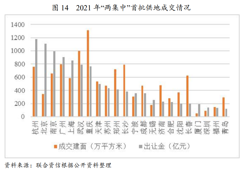 截至2021年6月底,22個城均已采用“兩集中”模式完成首批宅地供應,首批供地942宗(含14宗打包出讓的非宅用地),成交889宗,出讓金合計1.07萬億元,出讓金前五名城市包括杭州、北京、南京、廣州以及上海,金額均超800億元;蘇州、北京、天津等城市推地面積規模較大,均超過2020年的50%;10城實現零流拍成交,整體流拍率低于6%,同比下降明顯,主要源自長春、沈陽、天津等非熱點城市以及城市非核心地塊。