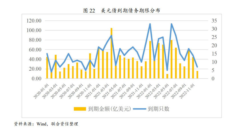從房企到期債務期限分布來看,2021年1月及3月房企已經歷一波償債高峰,進入2021年下半年,9月隨著部分進入回售期的債券數量的增加,房企到期債務量將呈現一波小高峰,隨后償債壓力將有所回落,但2022年房企到期債務壓力仍較大。美元債方面,2021年后半年到期債務數量及金額較上年有所下降,但進入2022年尤其是2022年上半年,美元債到期數量及金額將顯著增加,未來房企仍面臨較大的兌付壓力,需持續關注房企流動性風險及債務接續安排。