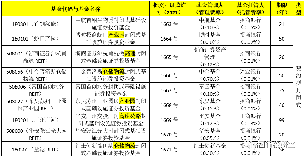 (五)由于投向底層資產為基礎設施(如產業園區、高速公路、倉儲物流等),因此期限較長,20年至100年不等,目前9只公募REITs均為契約型封閉式,且封閉期內不得辦理申購與贖回,也即不存在申購費與贖回費。