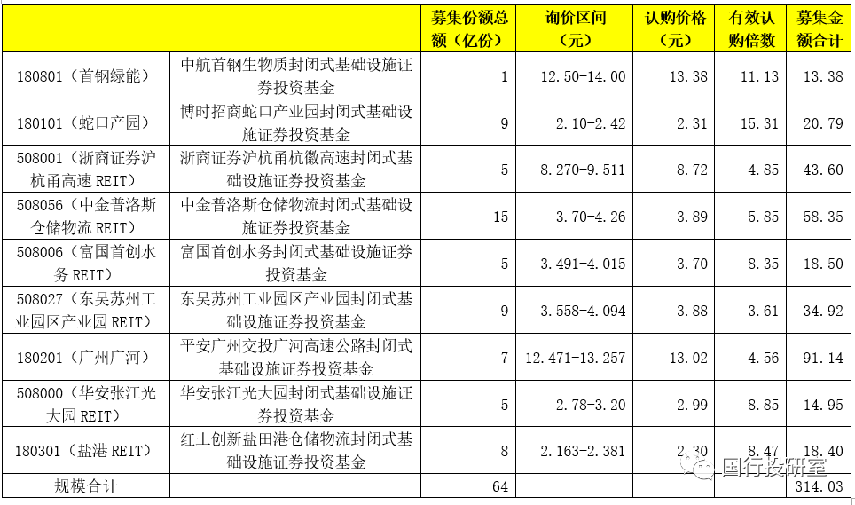 (一)根據認購價格和募集份額計算,9只公募REITs產品的募集金額合計為314.03億元,最高者為91.14億元(平安廣州交投廣河高速公路封閉式基礎設施證券投資基金),最低者為13.38億元(中航首鋼生物質封閉式基礎設施證券投資基金)。